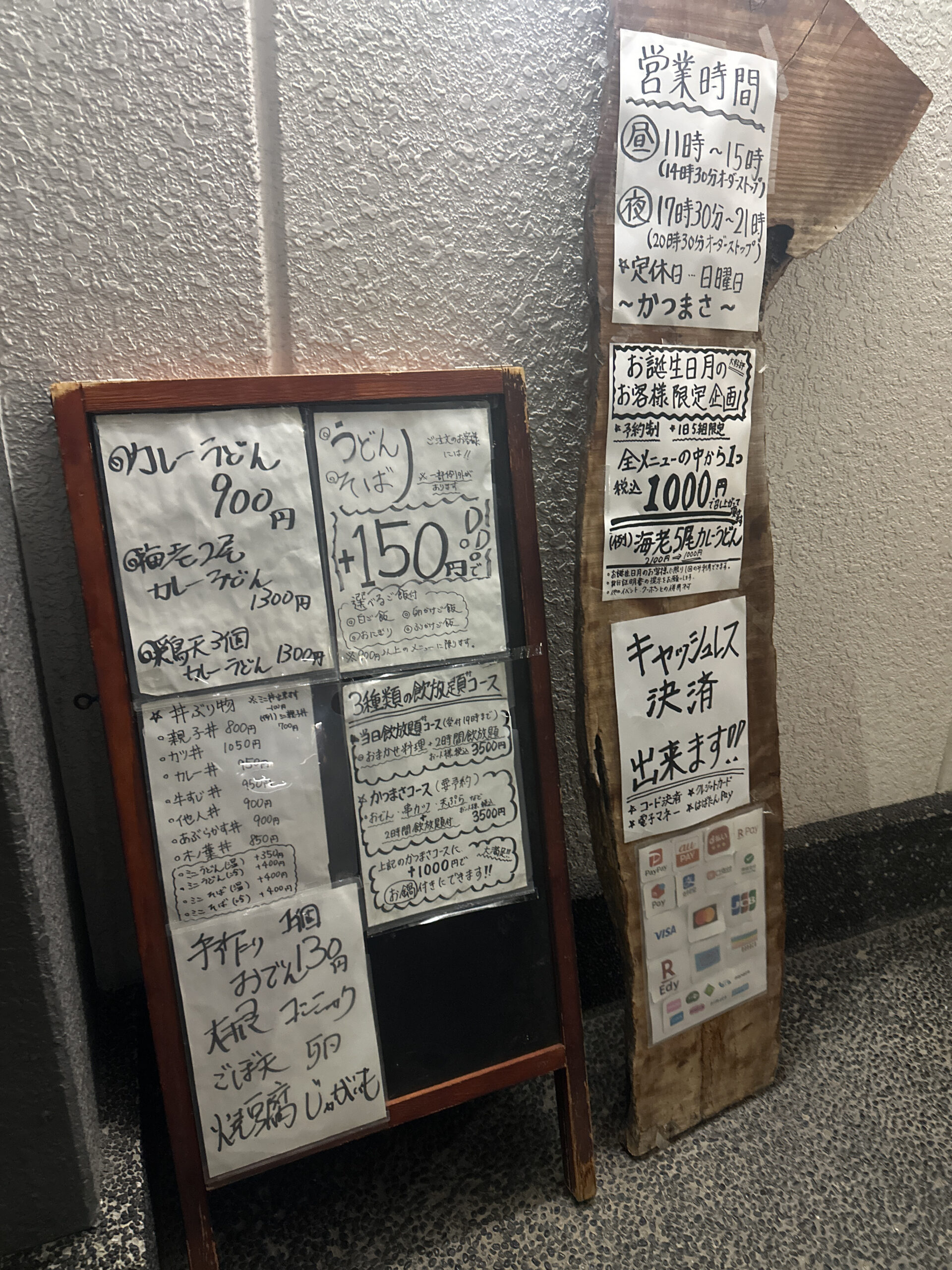お店の前につくとお店のメニューや営業時間の案内があります。