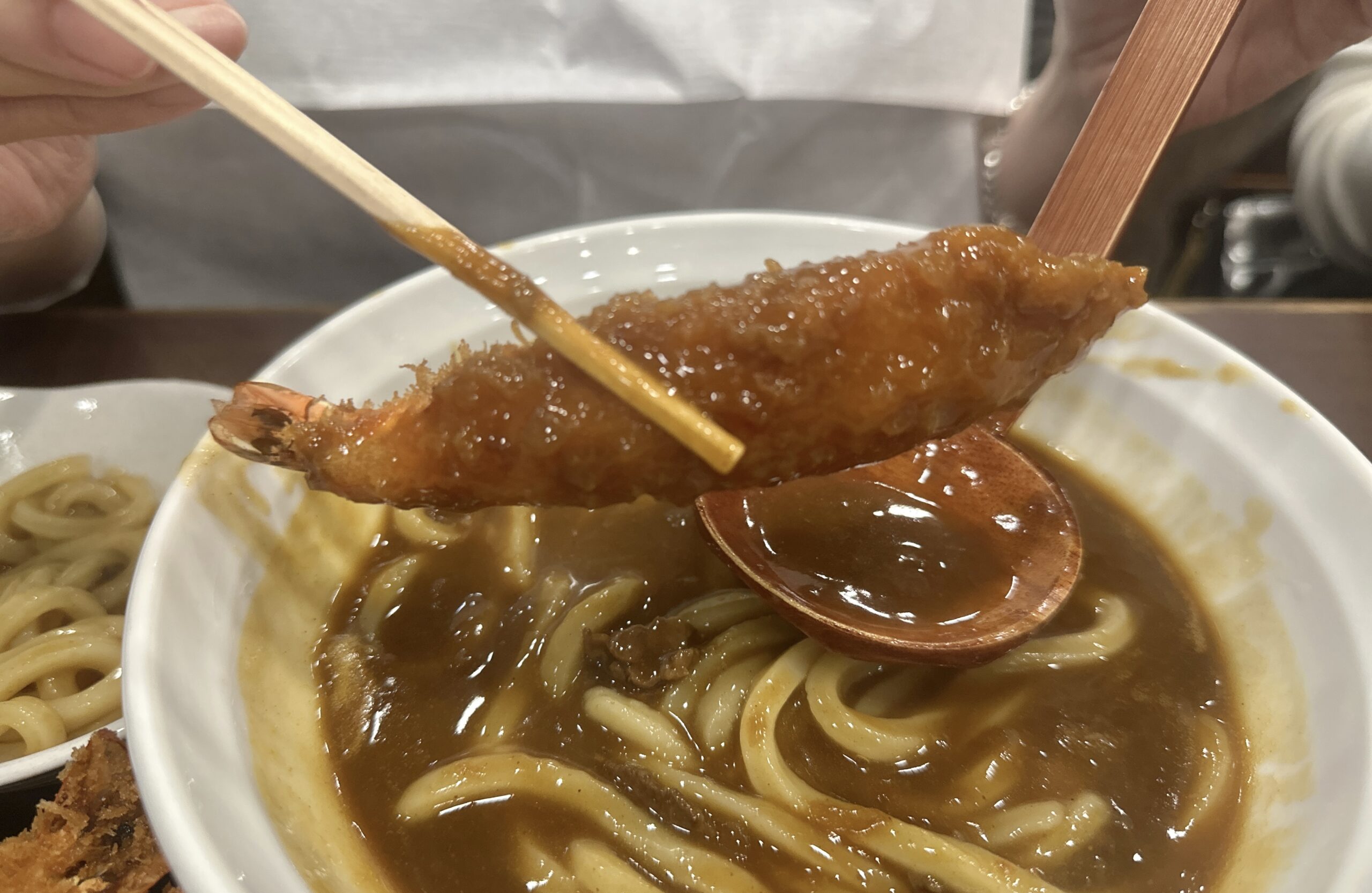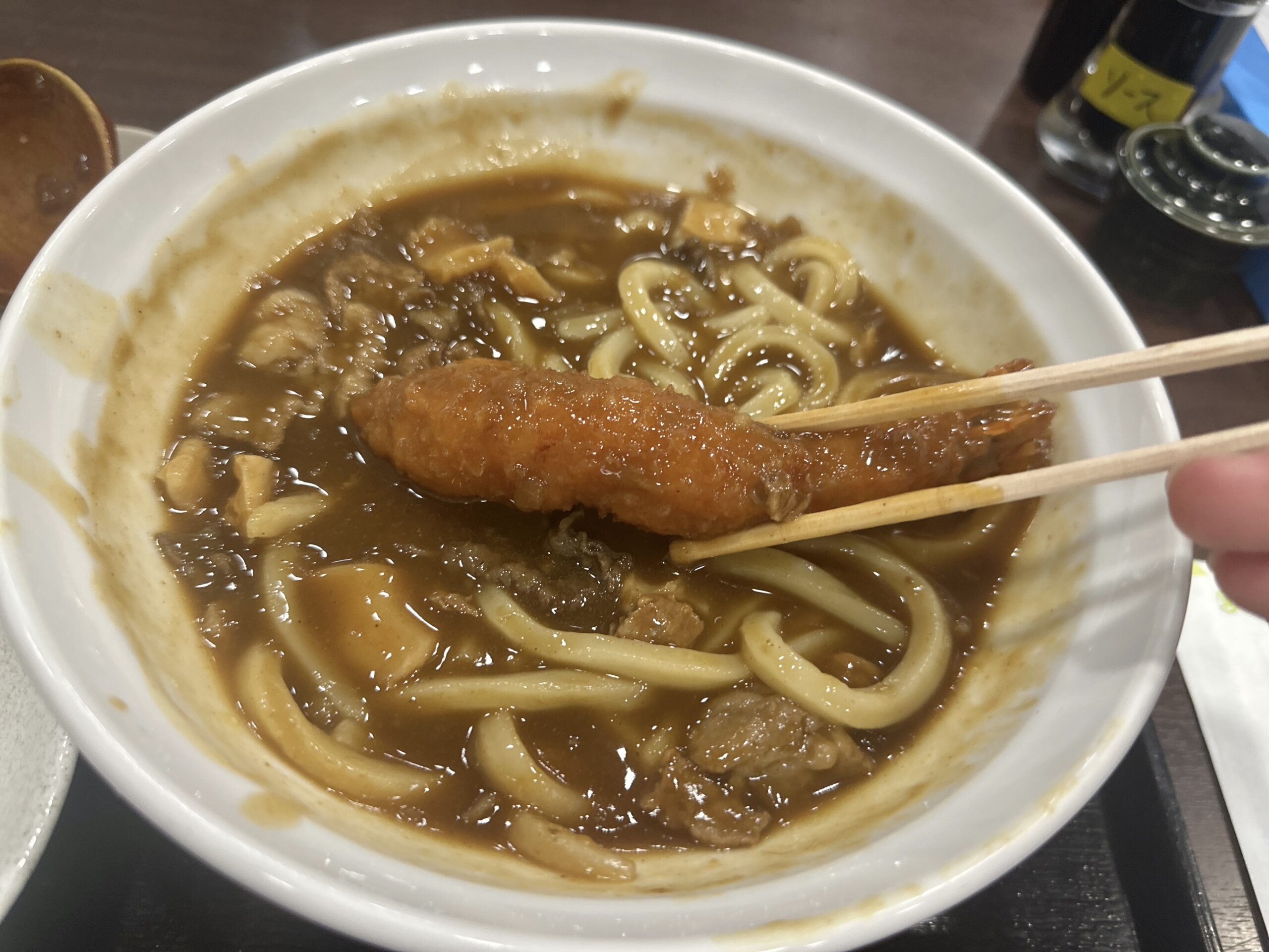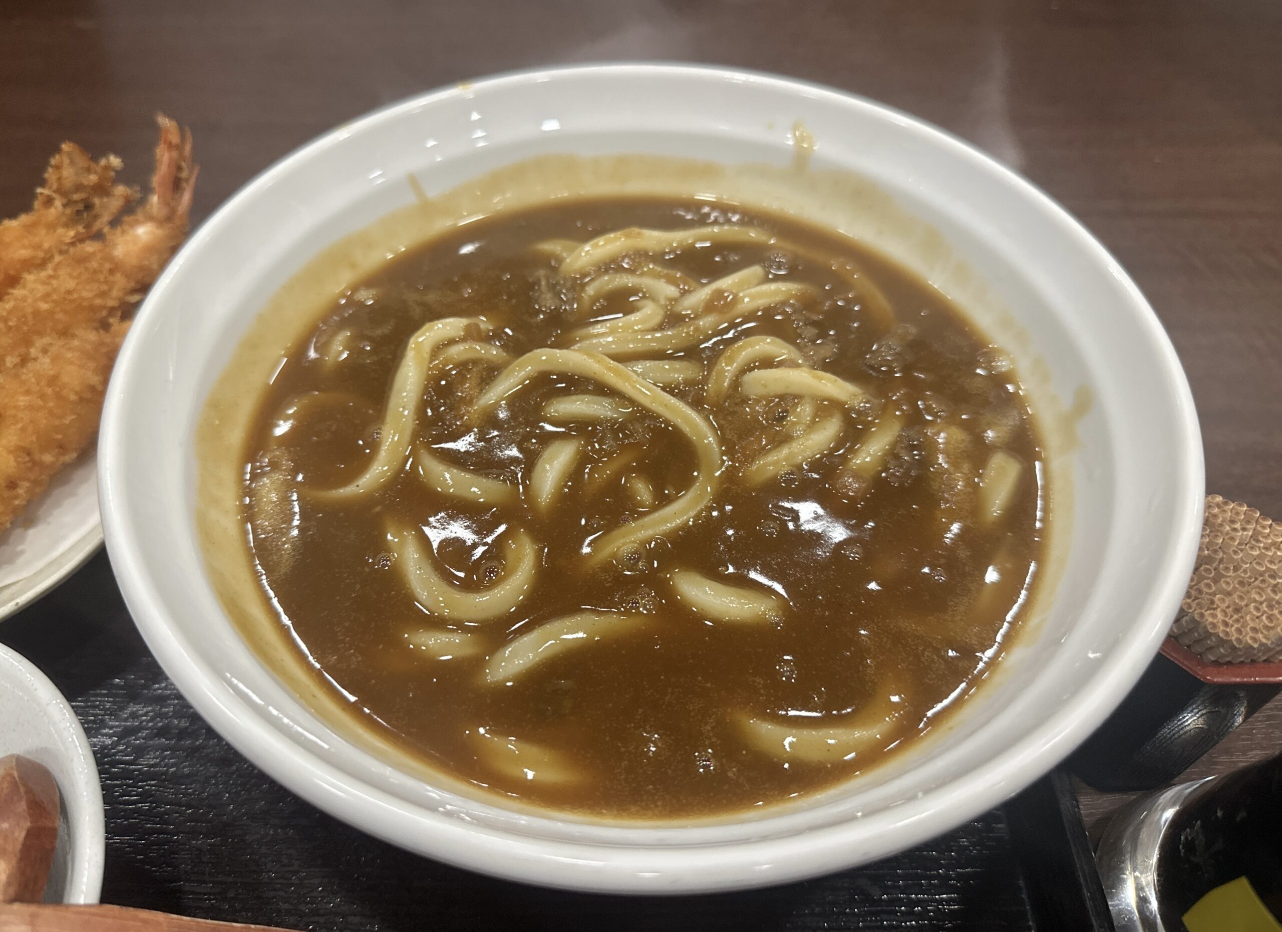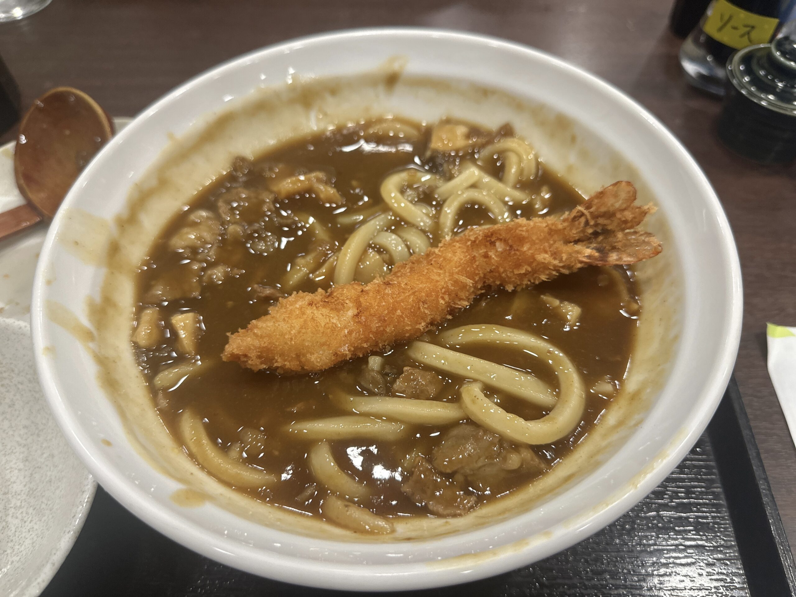 牛すじカレーうどんと海老フライは最強の組み合わせかもしれません。(牛すじカレーうどんは牛すじがたくさん入っているので海老フライは一本で丁度いいくらいです。)