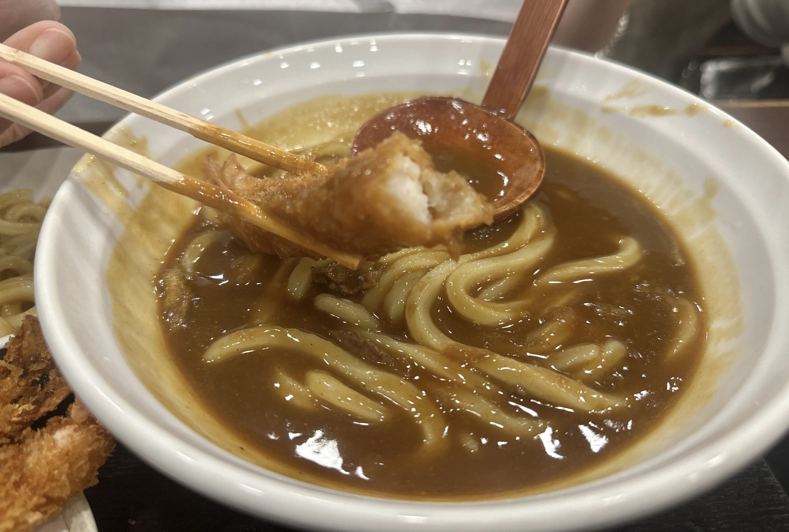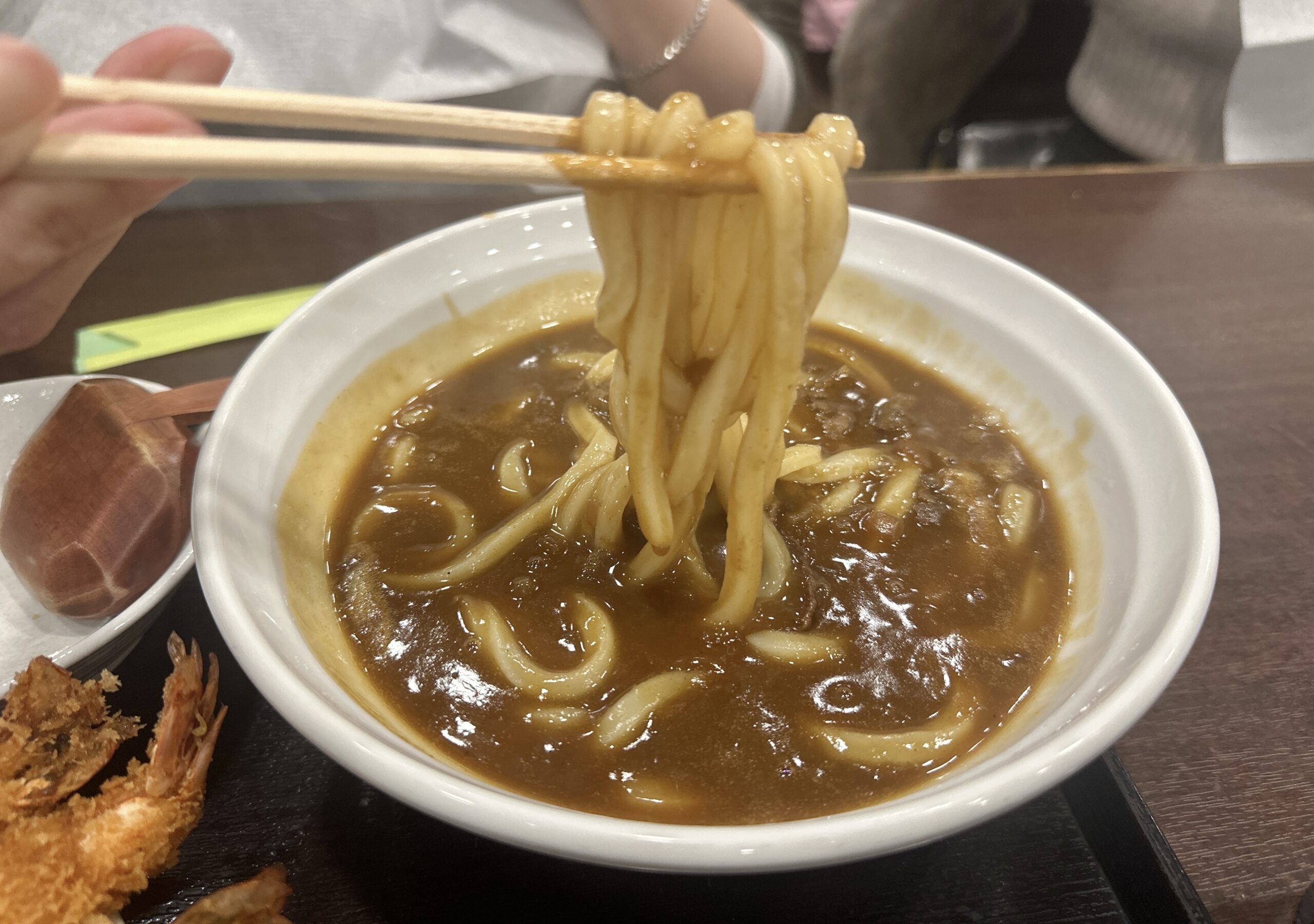 ここのカレーうどん、濃厚でめっちゃ旨い!麺は少し太めですが讃岐ほどのコシもないくらいで丁度いい!そしてカレーうどんの出汁にエビフライを浸らせて食べるともう絶品!