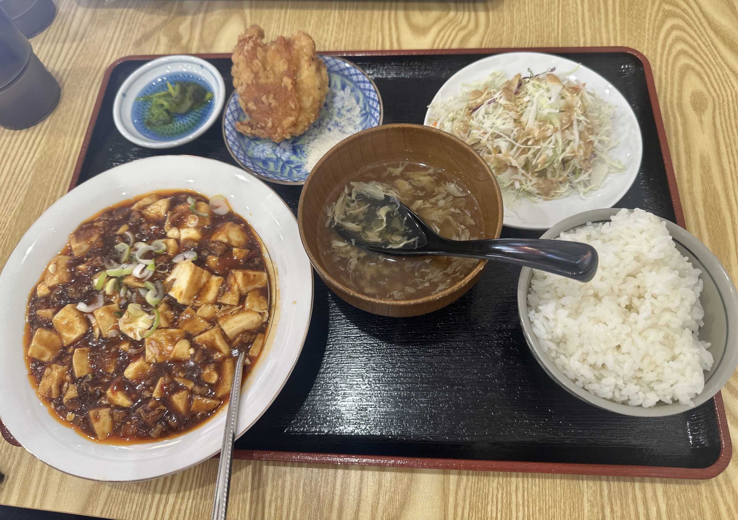 ご飯大盛り、麻婆豆腐(単品くらいの量)、おおきな唐揚げ1ケ、卵あんかけスープ、キャベツサラダ、漬物です。