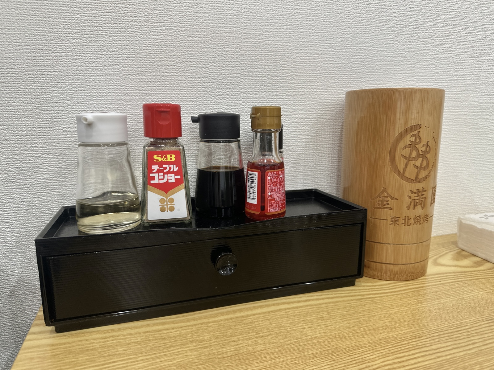 席に着くと調味料が・・・。普通です。ただ気になったのが金満園と書いた木の筒です。これは串を入れるっぽいですね。