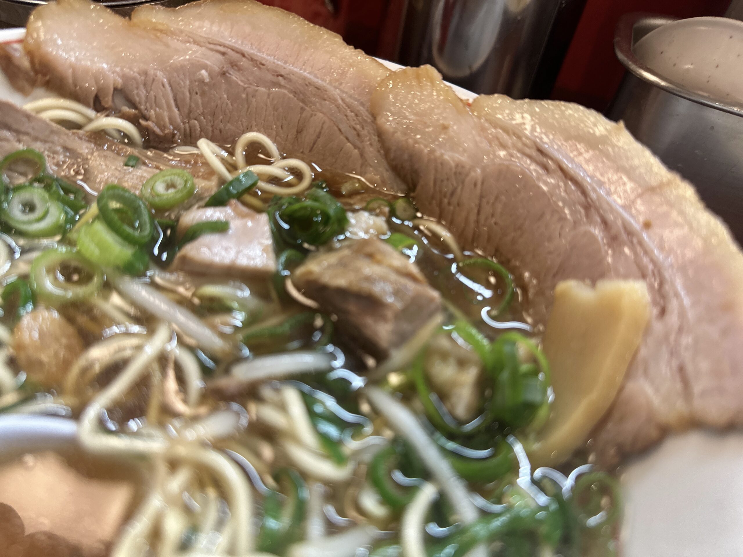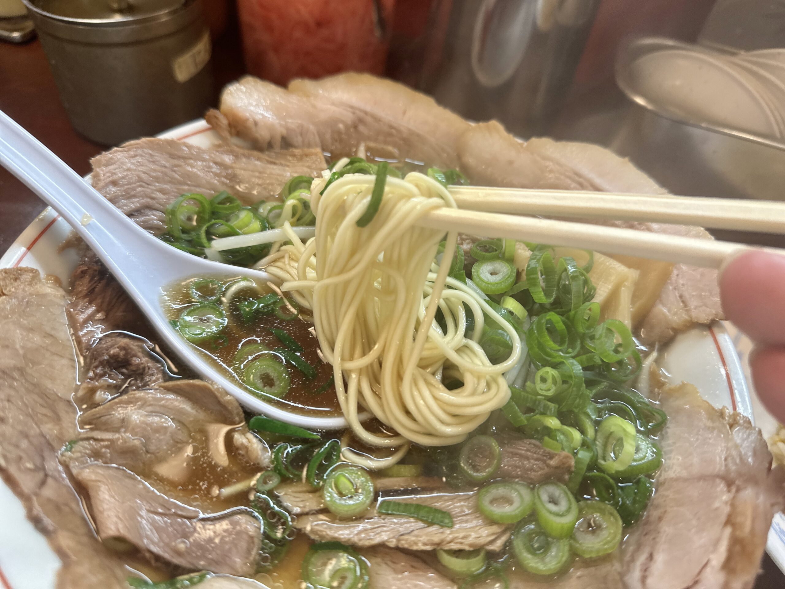 チャーシューまみれの中から出てくる細目のストレート麺、濃い目の醤油スープは病みつきになる一杯です!