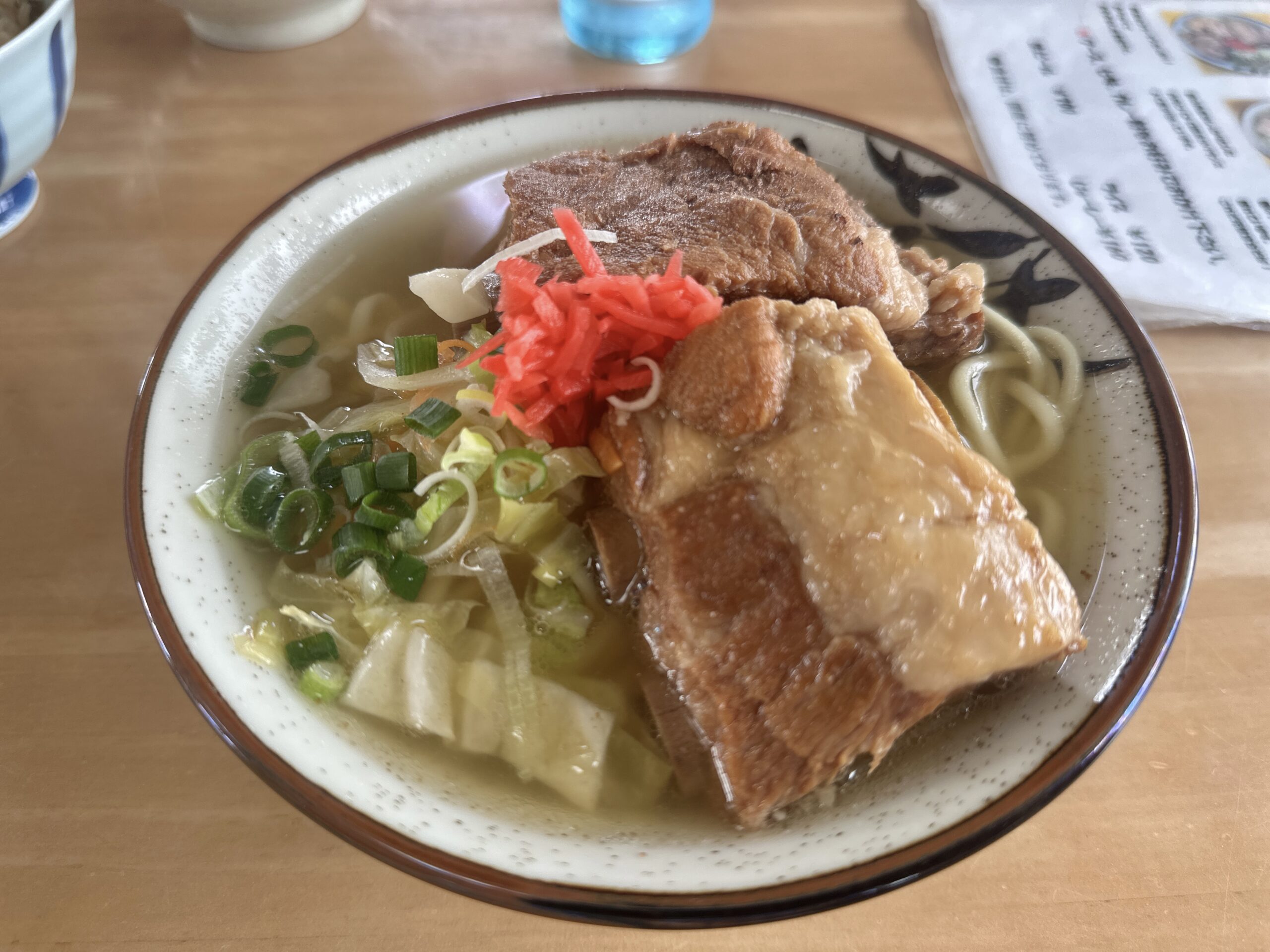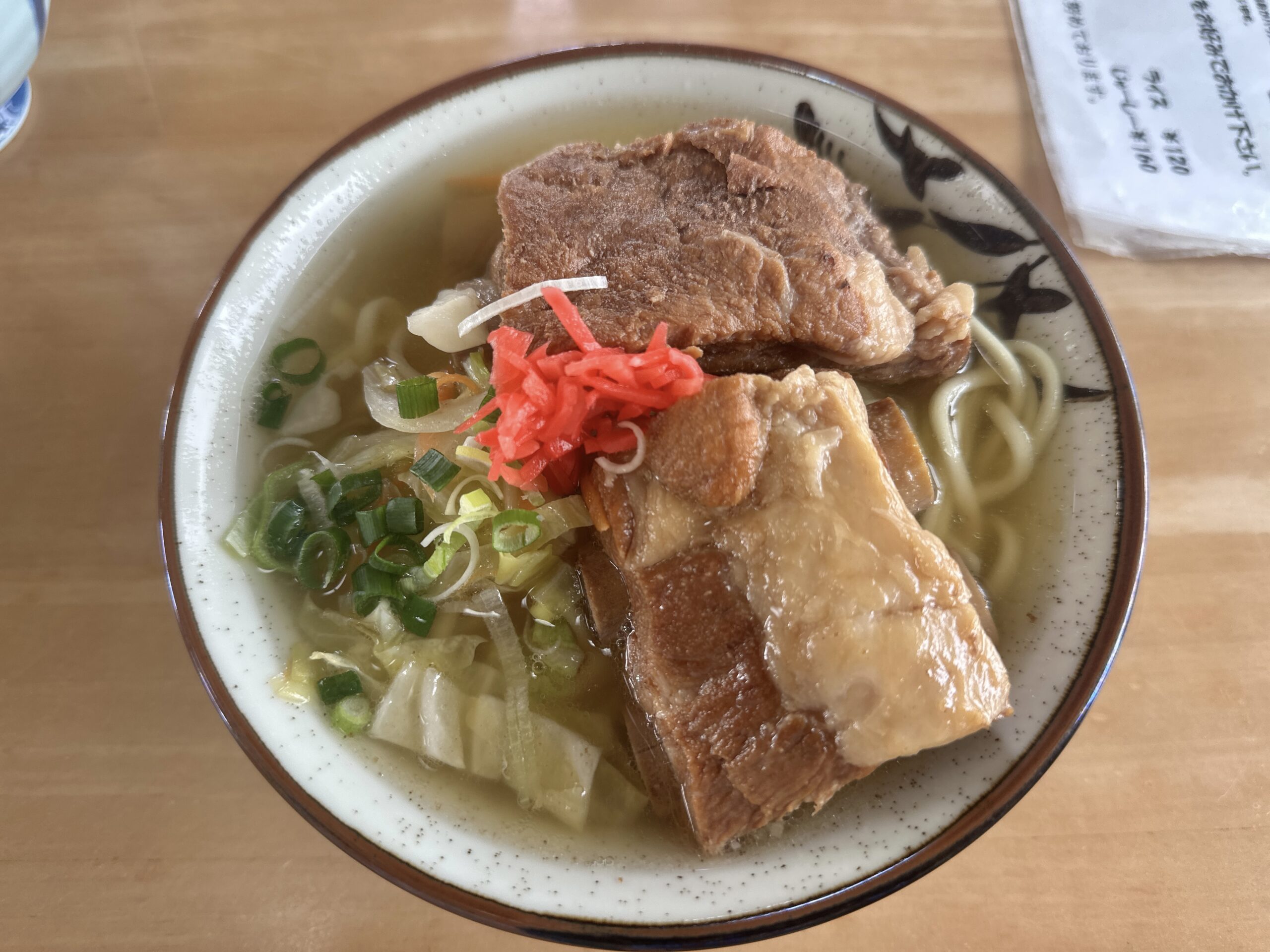 麺の下にはなんとでっかい豚肉とかまぼこが潜っています。スープはソーキそばより少し優しい感じで美味しかったです。