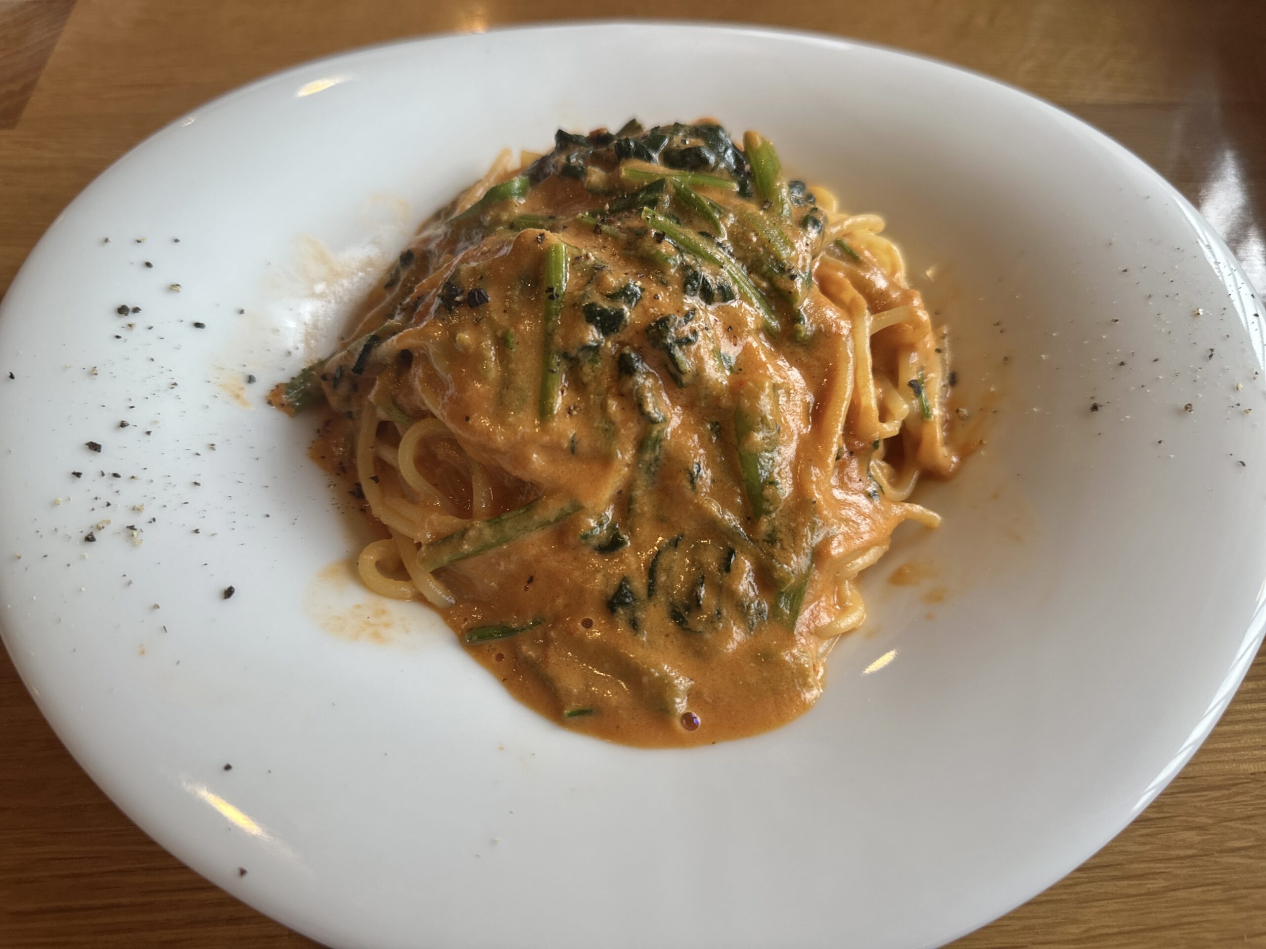 細麺を選んだこのパスタですが、細麺にしては少しだけ太目な感じでした。