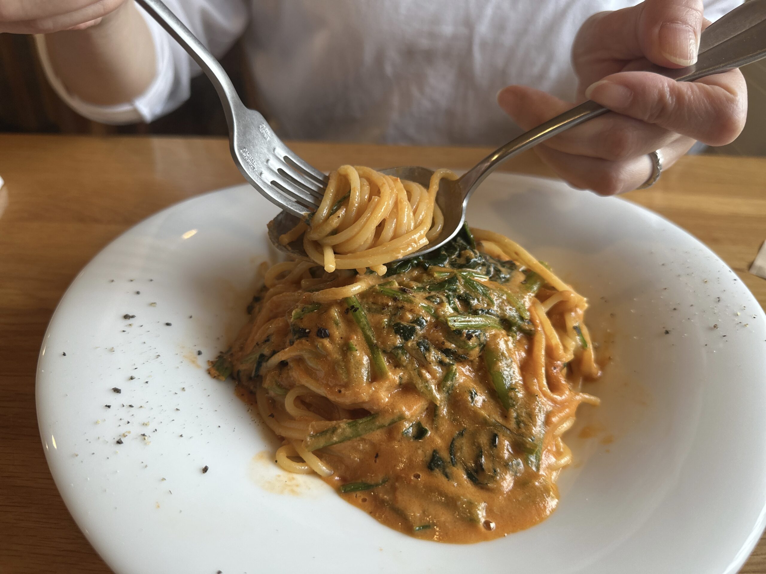 それではソースにパスタをしっかり絡めて頂きます!