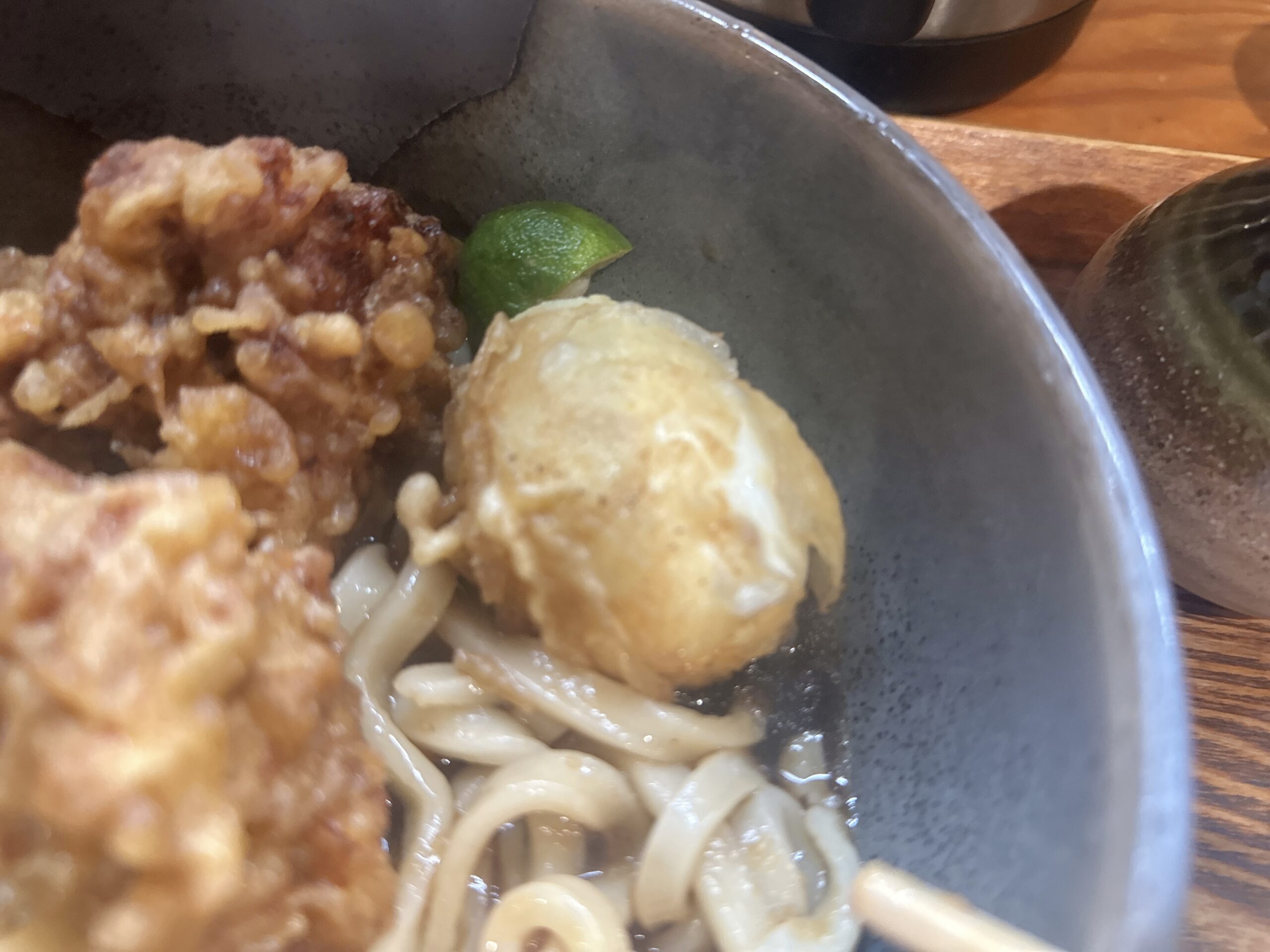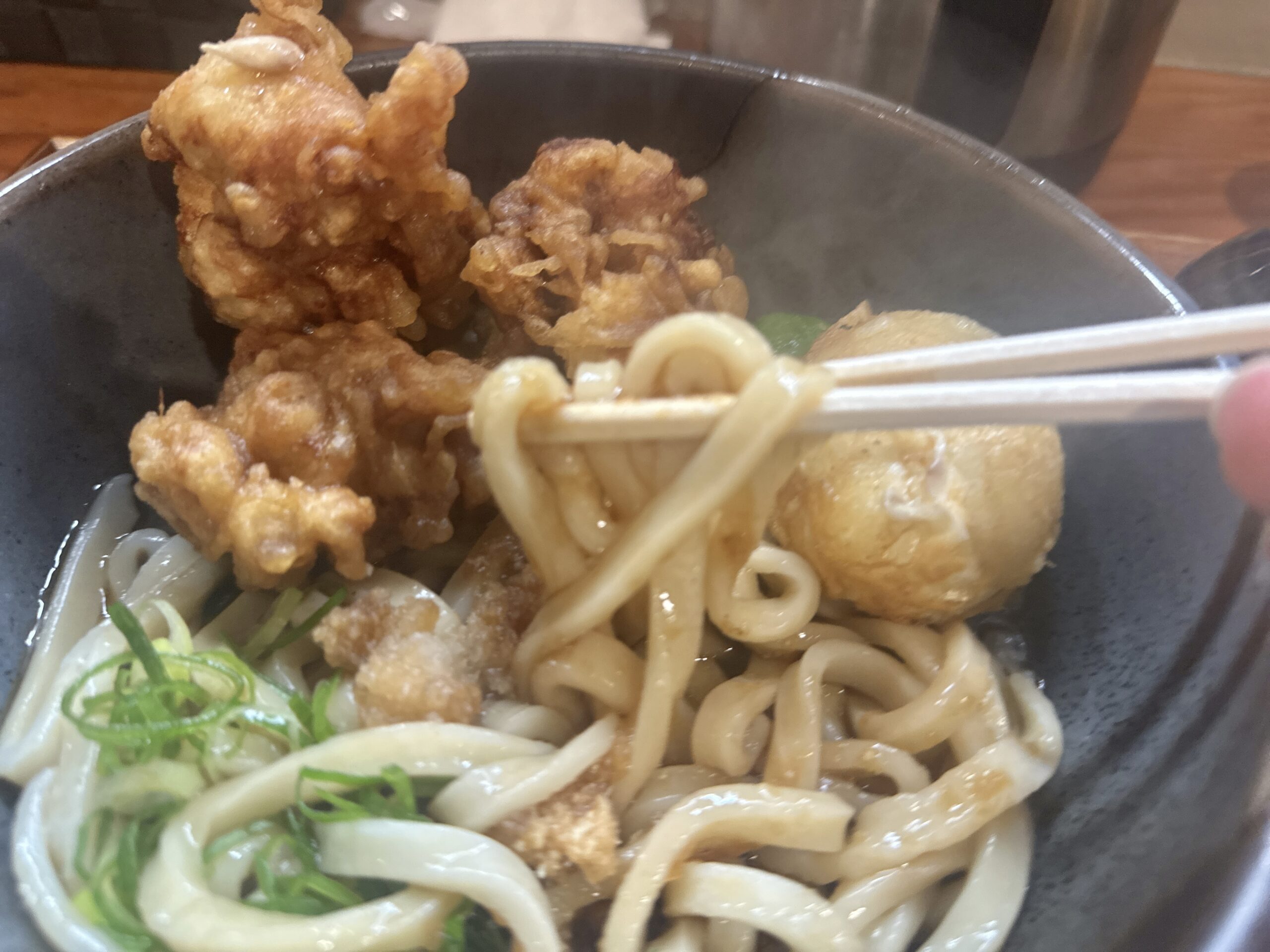 茹でたてほやほやの麺は程よいコシ・ツヤがあって美味しい!そして鶏天はもちろん熱々の揚げたてです!鶏天というかもはや唐揚げでしたけどとっても美味しかったです。