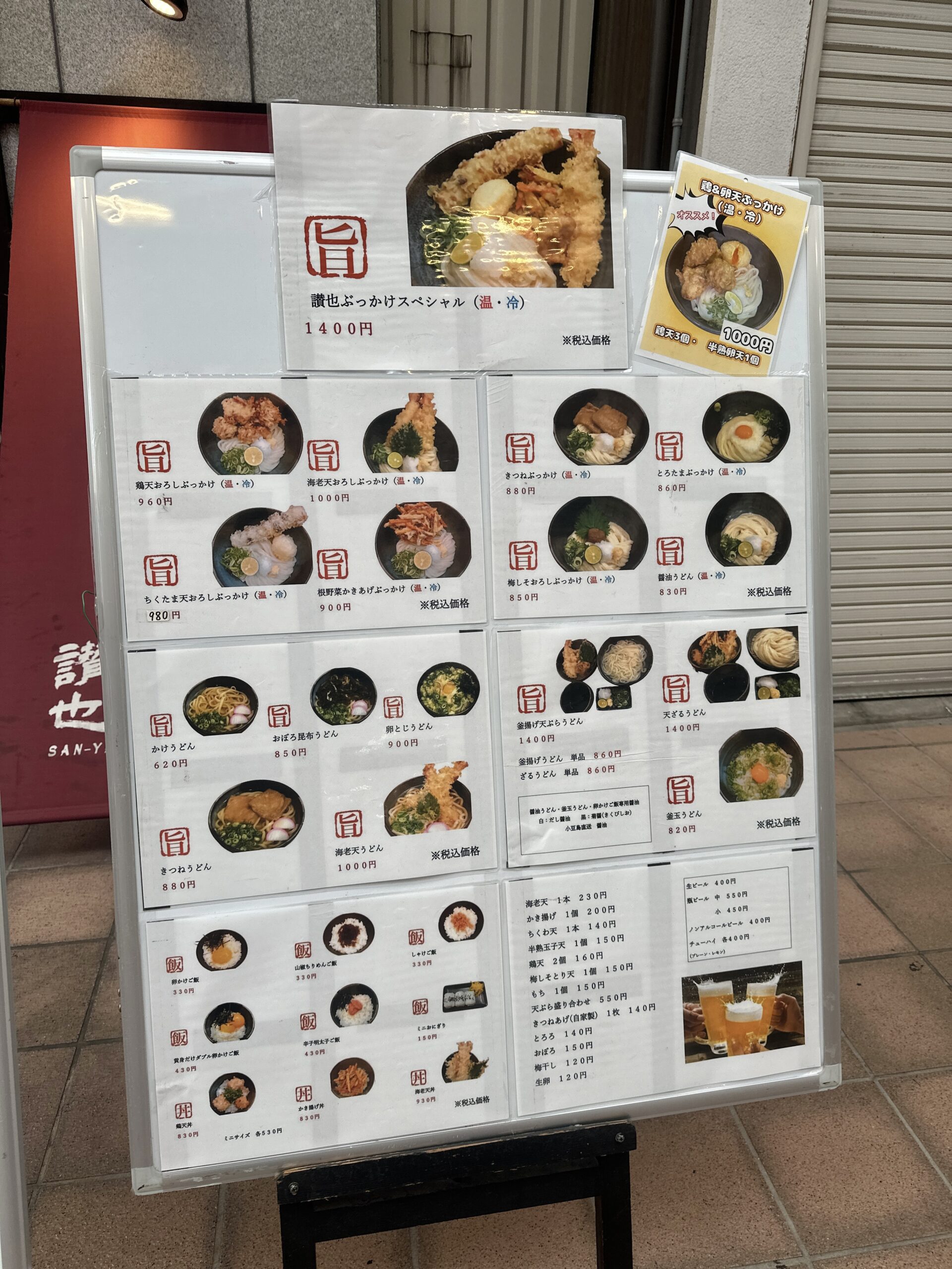 今回頂いたのはお店の前にあるメニューの看板にある オススメ!鶏&卵天ぶっかけ(温・冷) 1000円 です。