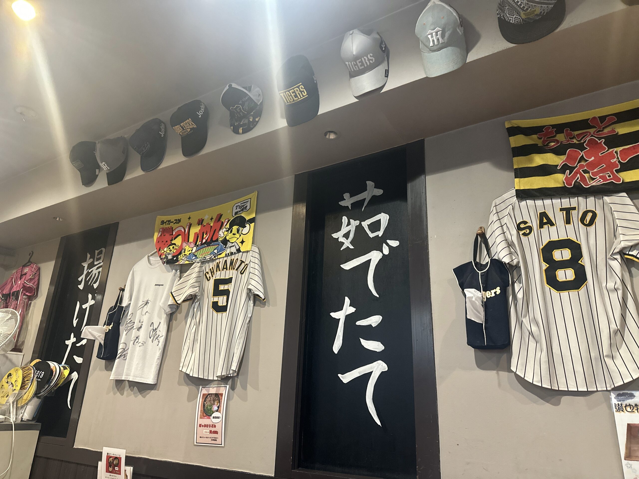 壁にたくさんの阪神タイガースのユニフォームや帽子、サインが飾られています。