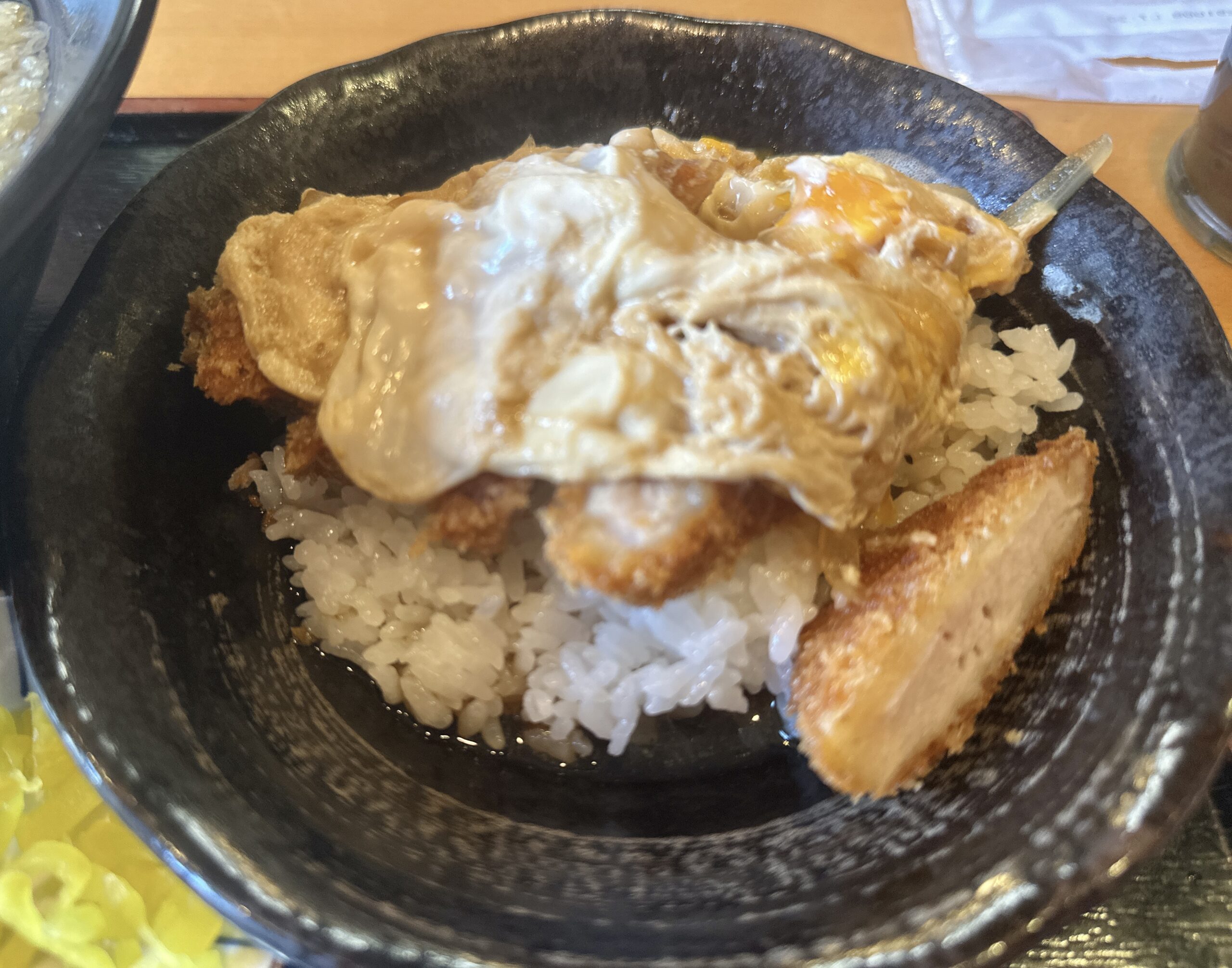 すくなめのご飯の上に贅沢にカツが4切れほど乗っています。玉子もたっぷり。