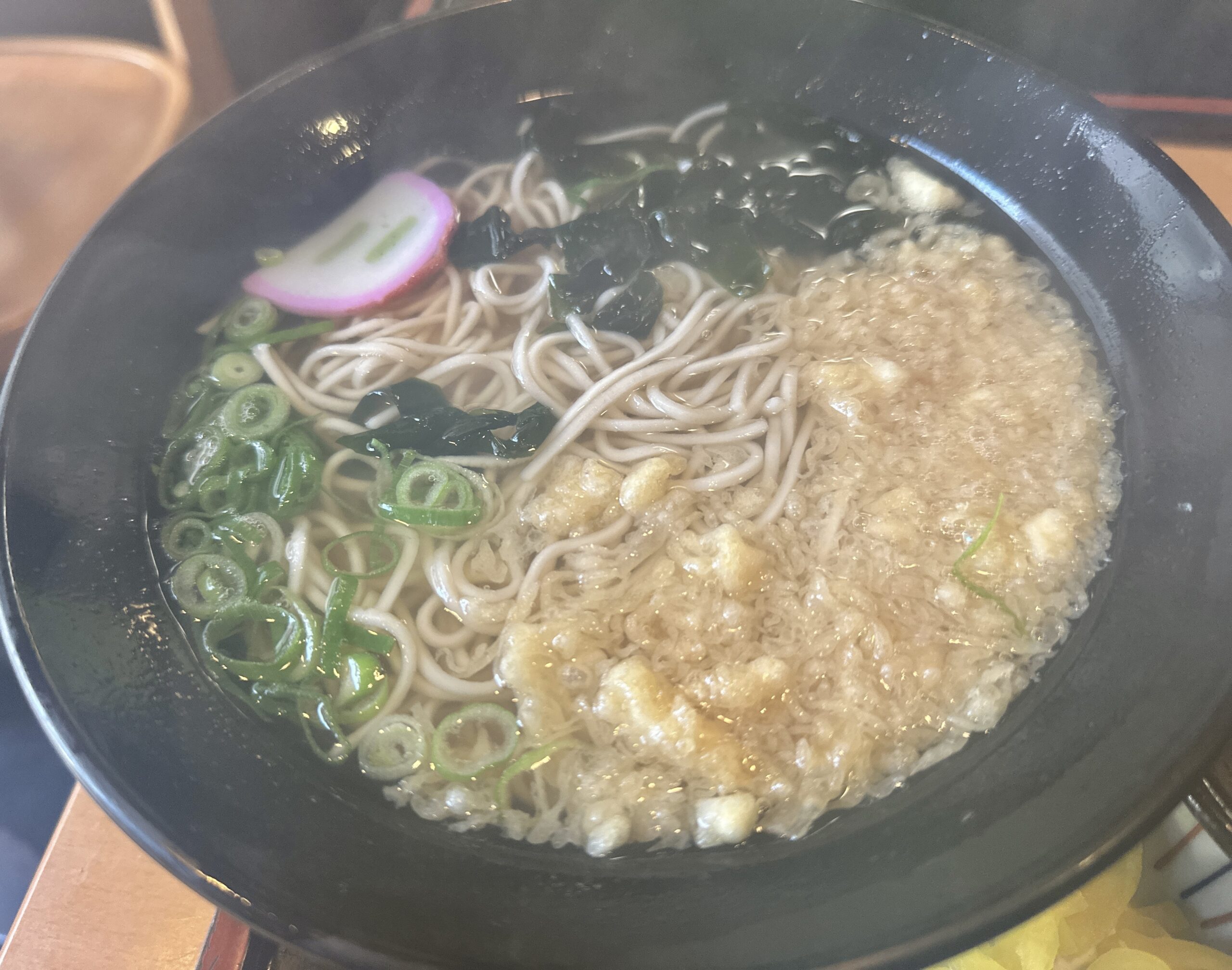 すこし多めの天かす、わかめ、ねぎ、かまぼこが入っています。