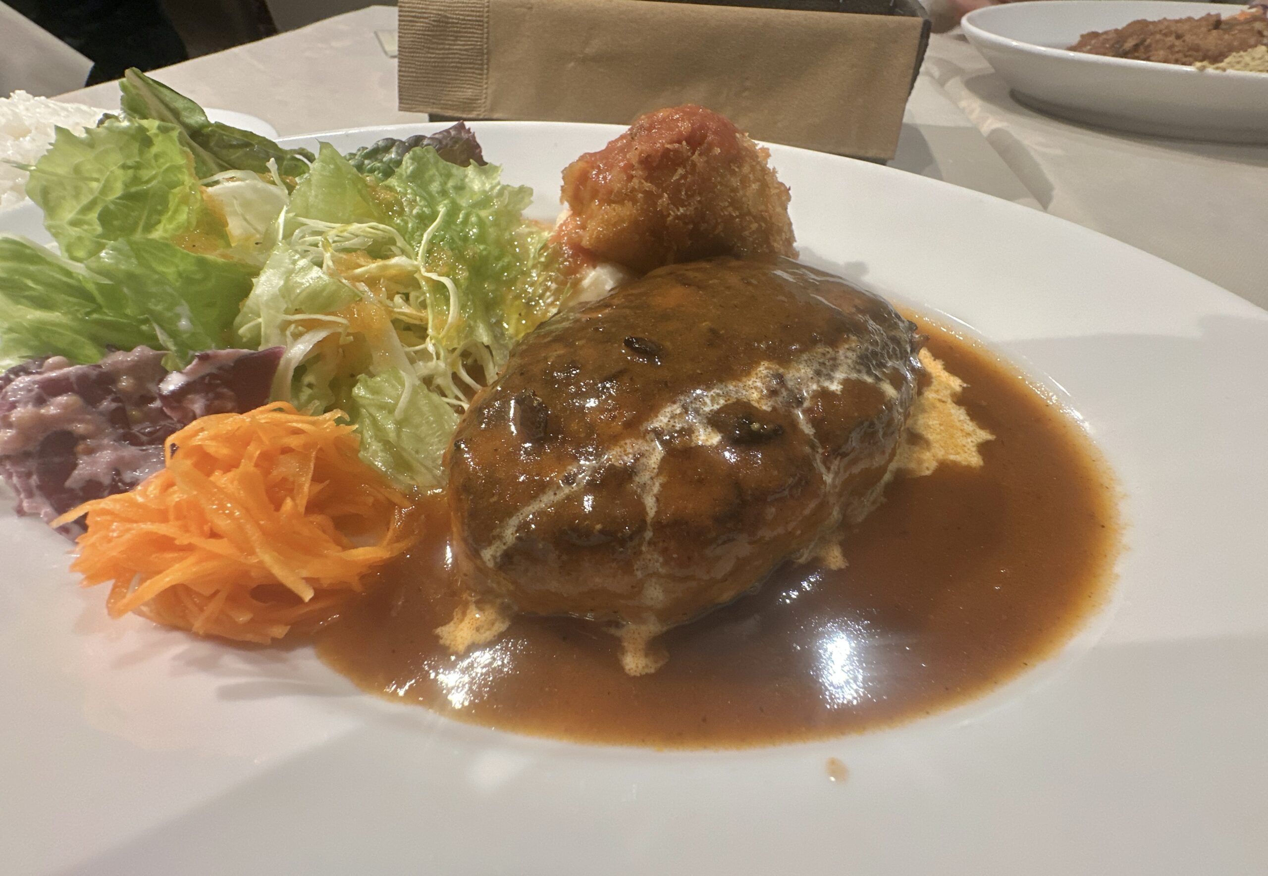 ハンバーグもめっちゃふわふわでとても柔らかくて、噛めば口の中で肉汁が溢れてくる・・・そんな一品です。