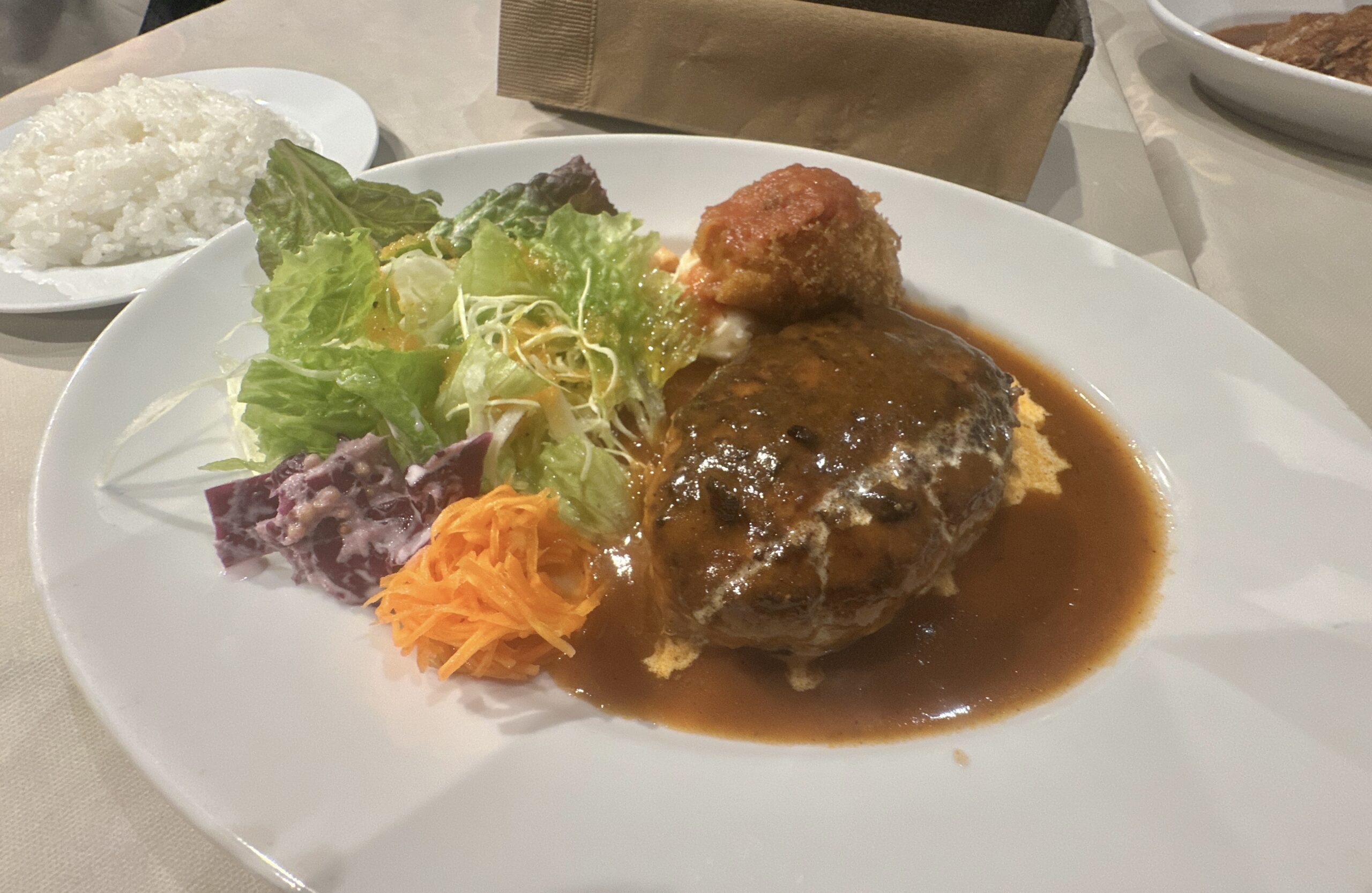 デミグラスソースとお肉の相性が良く、脂っぽさが全然感じられないので最高に美味しく頂く事が出来ます。