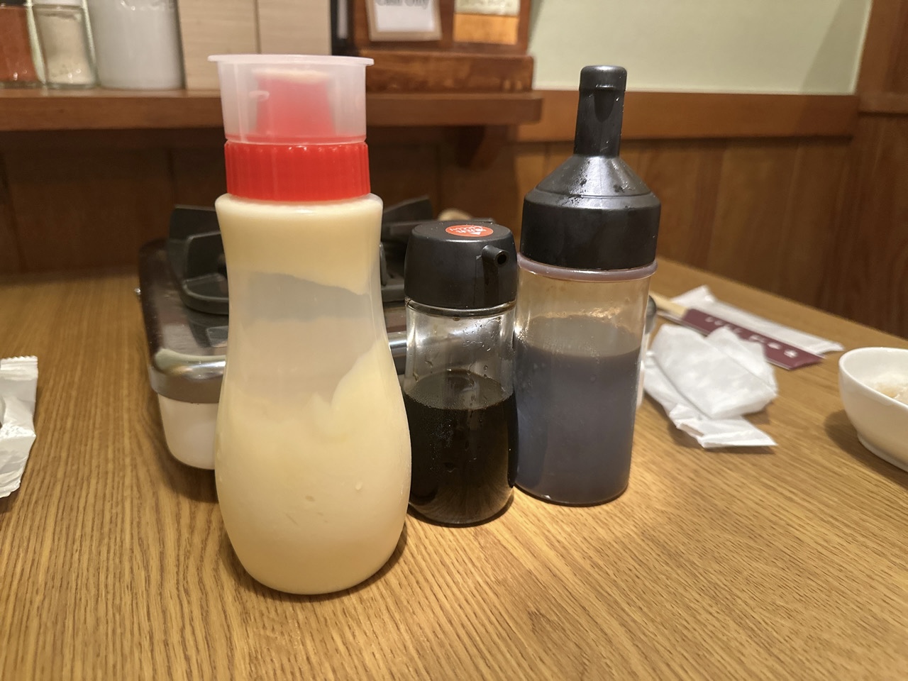 左からマヨネーズ、ウスターソース、ソース(多分とんかつソース)の3つ。