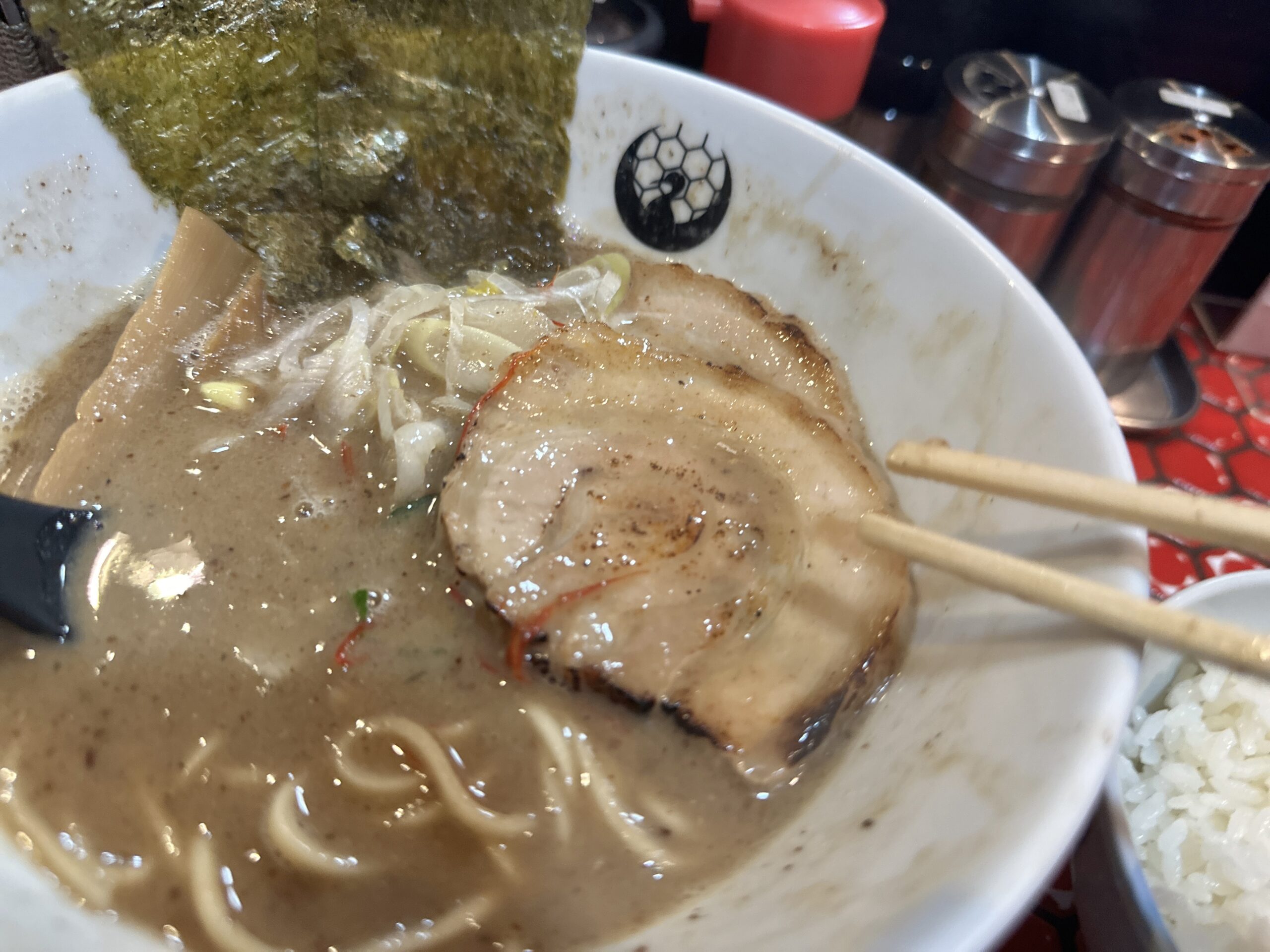 トッピングは大きくて分厚い炙りチャーシューが2枚、メンマ、海苔、ネギ、糸唐辛子などが入っています。